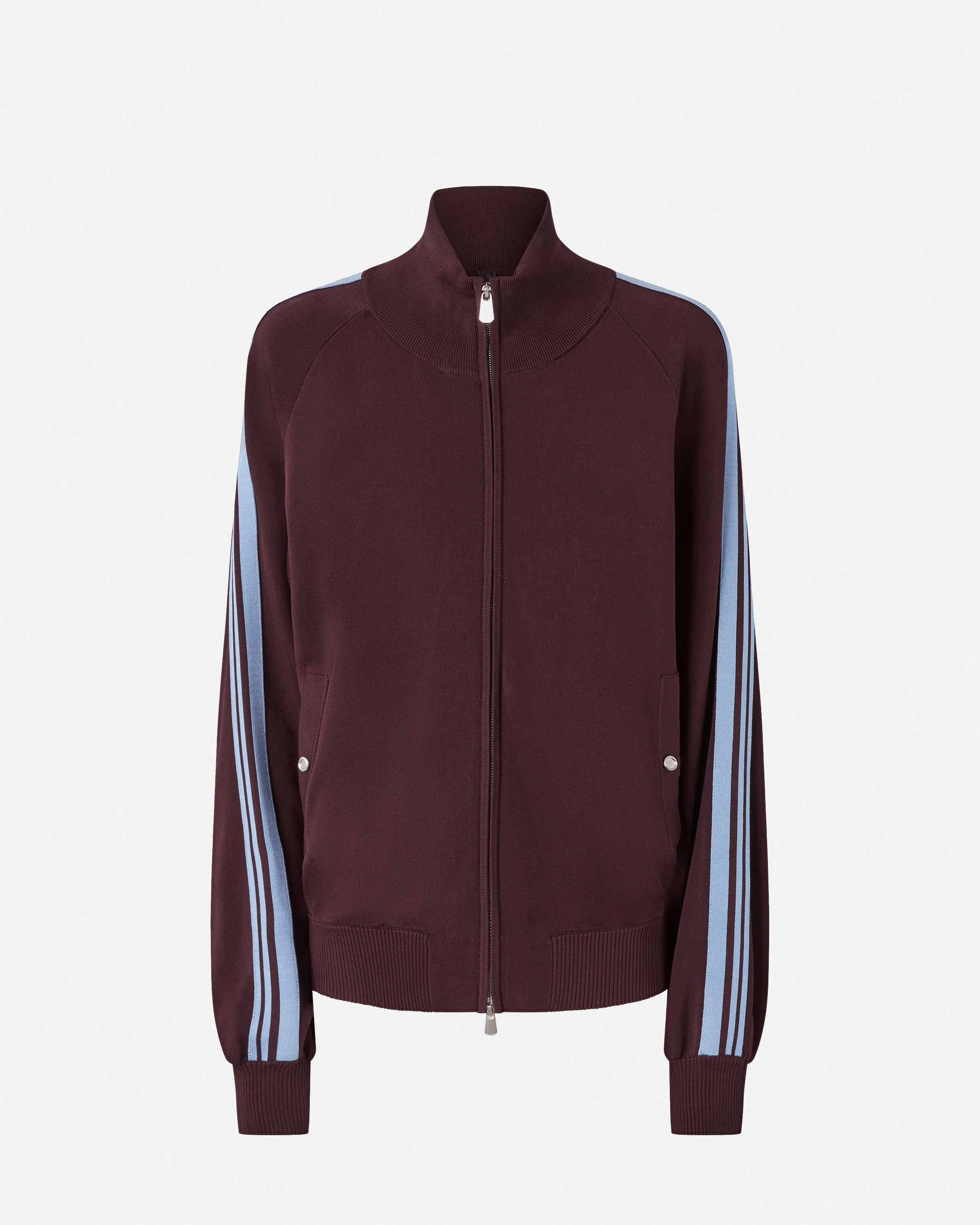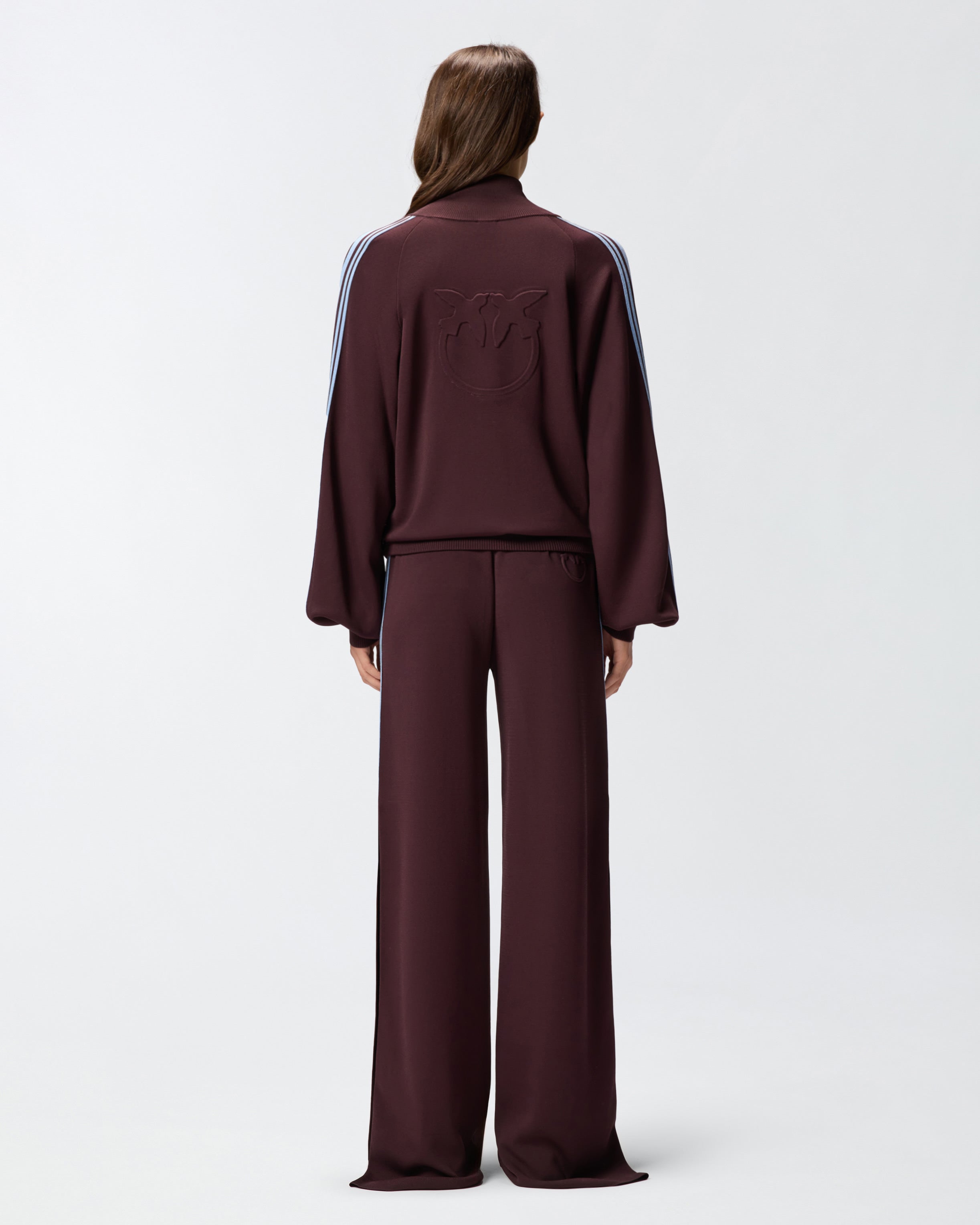 High-neck sports sweatshirt with zip, made from technical fleece-effect pique fabric, trimmed with contrasting side bands along the sleeves. The neck, hem and cuffs are elasticated and ribbed, while the final touch is given by the Love Birds maxi-logo embossed on the back. The piece has undergone finishing tests to minimise the possible formation of pilling, ensuring greater fabric softness and durability. Pair the design with trousers of the same material for a sporty look par excellence.